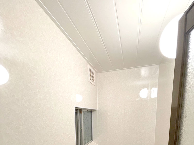 壁を一新したいとのことで、ユニットバスの導入も検討しましたが、サイズがかなり小さくなるため、今回は既存の下地に新しいパネルを貼るバスパネル工法を採用しました。