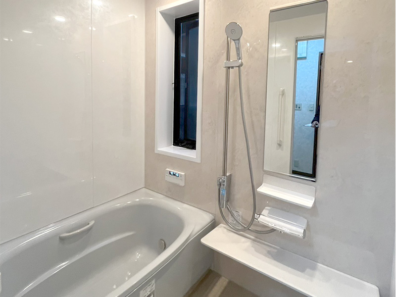 | 商品仕様 | 浴室:LIXIL リデア Mタイプ 1318サイズ(アクセントパネル:マーフィルベージュ、ベースパネル:クルムホワイト、浴槽:人造大理石 グレー) | ||