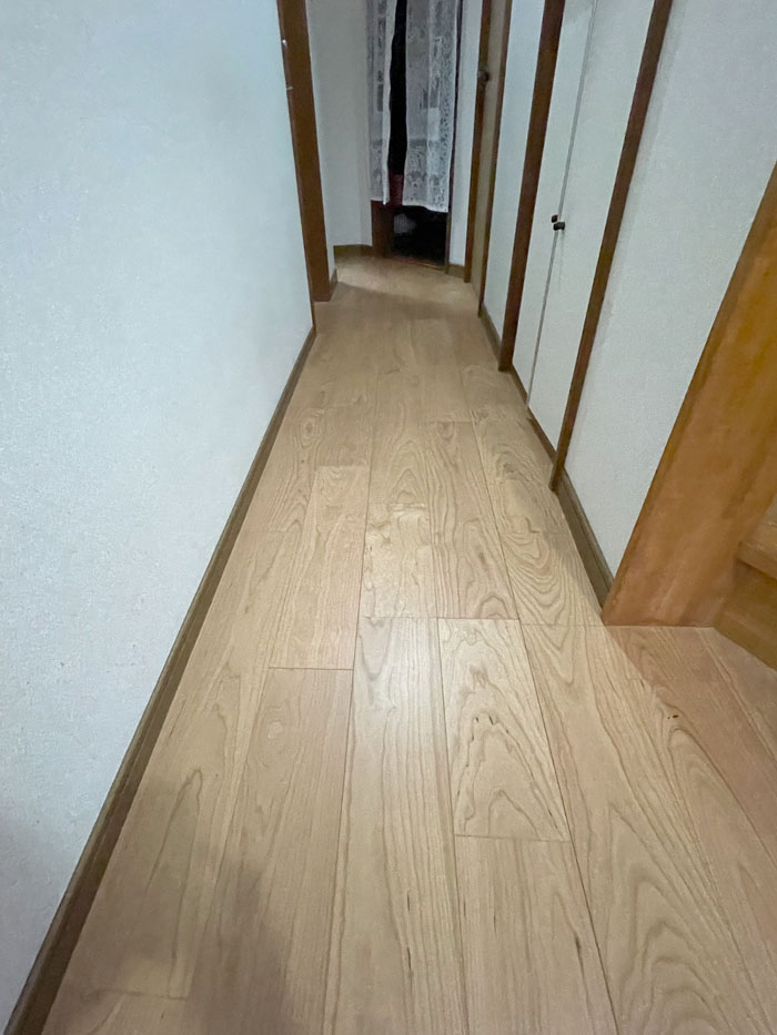 明るい色のフローリングになり、雰囲気がガラッと変わった廊下